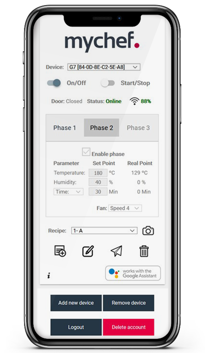 Gérez et restez connecté à votre four depuis n'importe où avec votre mobile, votre ordinateur ou votre tablette. Visualisez le four en temps réel, sa géolocalisation, consultez l'analyse des données, visualisez vos recettes ou créez-en de nouvelles et envoyez-les à votre équipe, en appuyant simplement sur un bouton ! Vous pouvez également partager tous les contenus avec le reste de vos fours à cuisson accélérée Mychef.